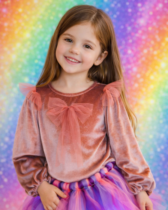 Această bluziță din catifea cu sclipici este ca o poveste coborâtă direct din cărțile de basme. Cu această bluziță fermecătoare, veți aduce strălucirea și bucuria sărbătorilor în viața micuței dumneavoastră.