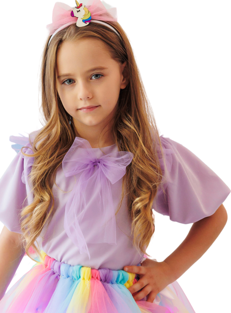 Bluziță de-a dreptul minunata, din bumbac soft, ușor de întreținut și purtat. Dar cu un efect magic dat de volănașele din tulle ultra soft lila.