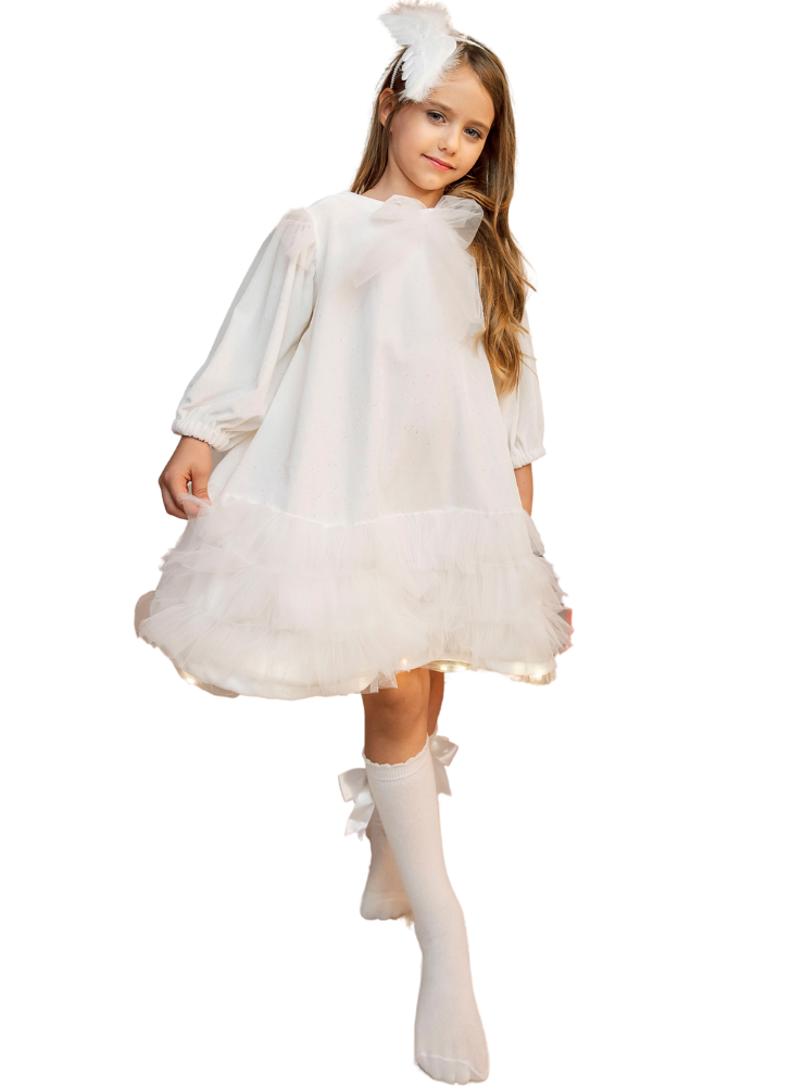 Rochița cu mânecă lungă, volanașe din tulle moale si fundiță delicată la gât.