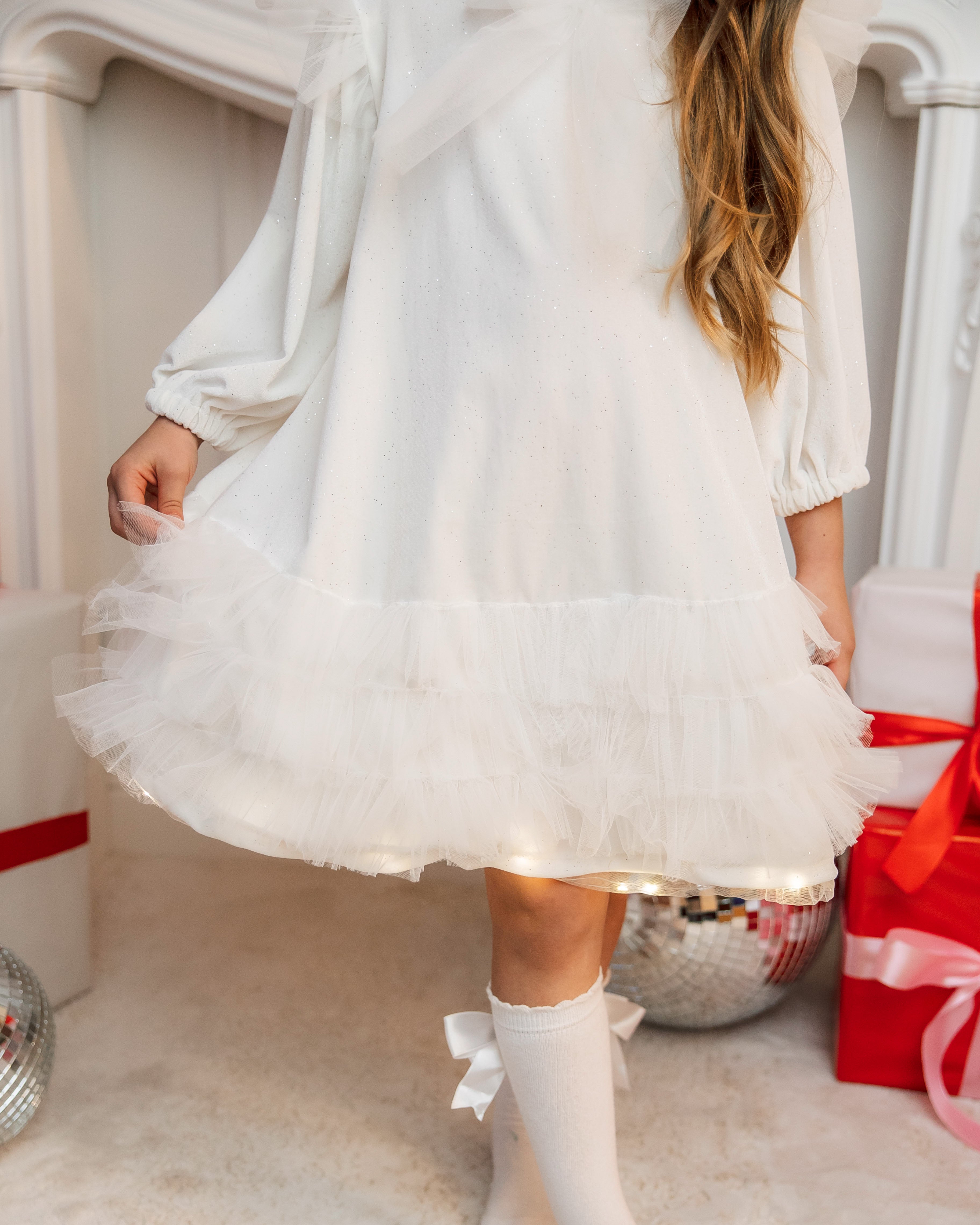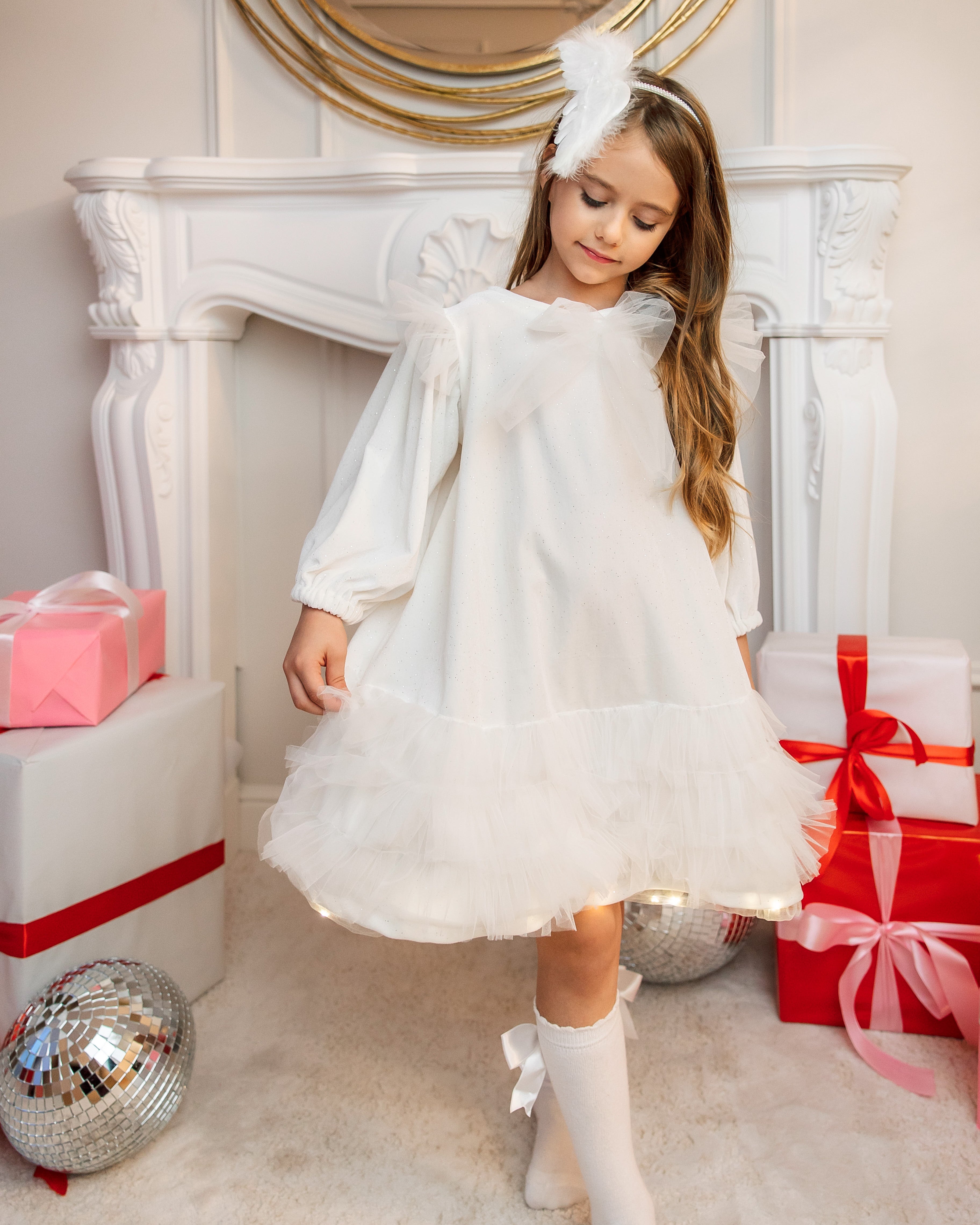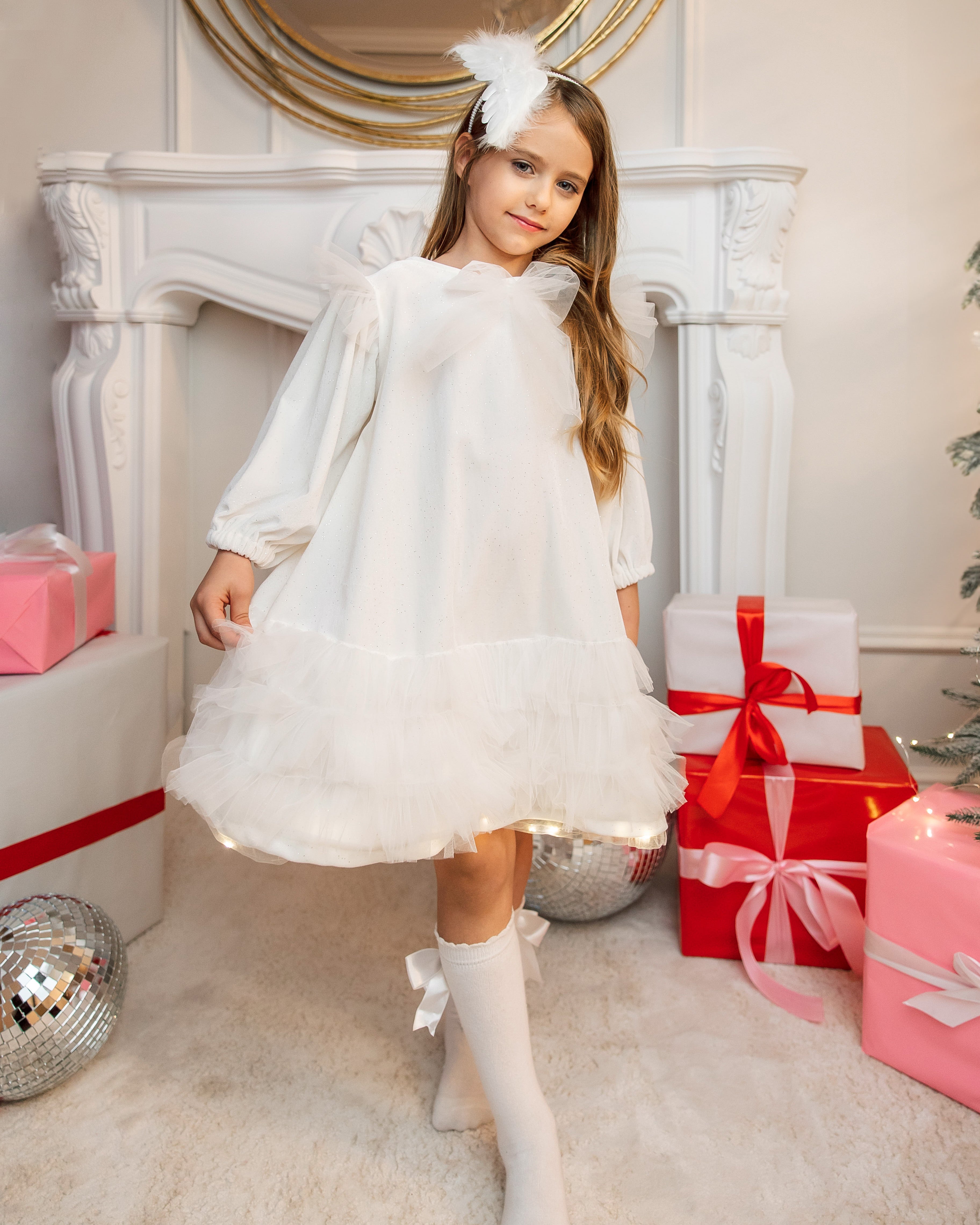 Această rochiță aduce cu ea farmecul și magia Crăciunului, încorporând în designul său nuanța pură de alb și luminițele subtile. Cu o combinație de îngeri și fulgi de nea, această rochiță este alegerea perfectă pentru a transforma micuța dumneavoastră într-un adevărat înger de iarnă în timpul sărbătorilor de Crăciun.