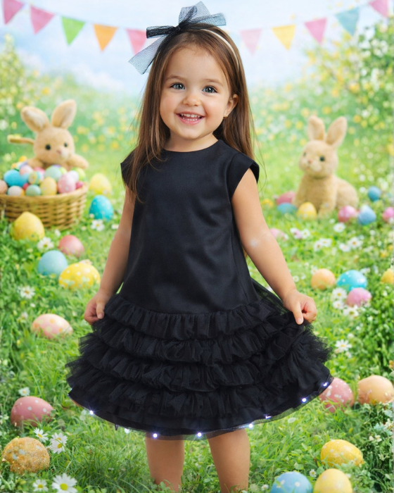 Rochiță din tafta elastica fină neagră. Volănașe din tulle moale negru cusute in 5 straturi la baza rochiței, ceea ce ofera un super efect.