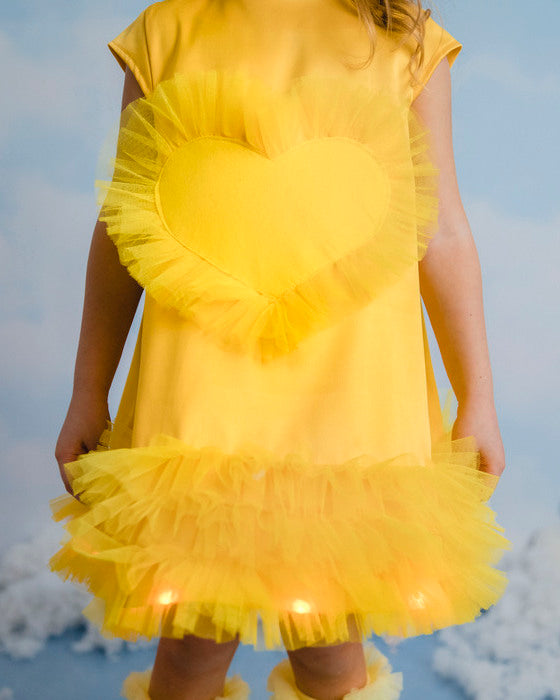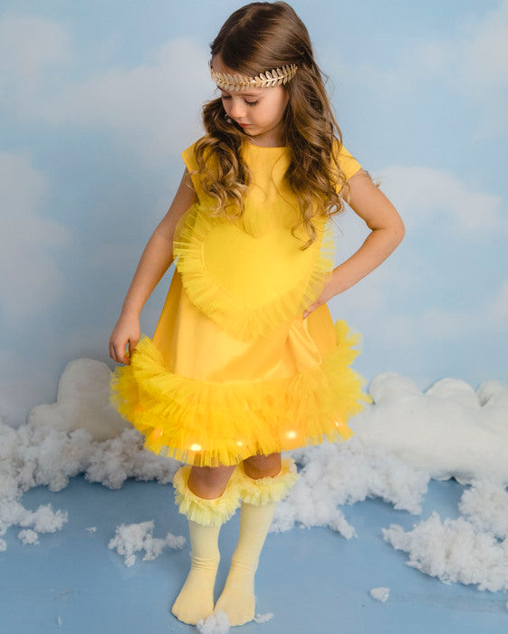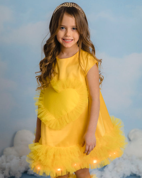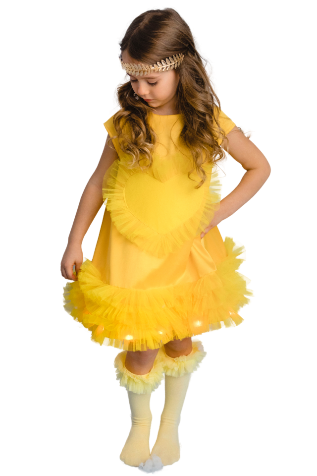 Rochiță din tafta elastică fină galbenă. Volanașe din tulle galben cusute in 3 straturi la baza rochiței, ceea ce ofera un super efect. Inimioară dragalașă din fetru galben, ca o frunza de toamna.